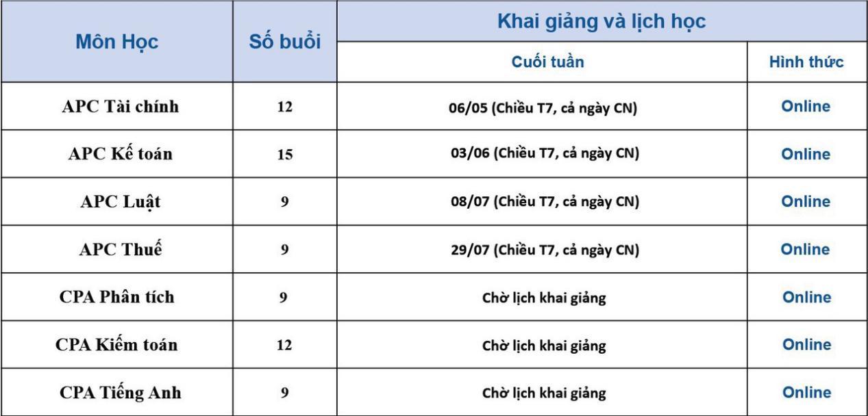 Chương trình dành cho các học viên ôn thi chứng chỉ hành nghề kế toán (APC) sẽ là 4 môn đầu và học viên thi chứng chỉ hành nghề kiểm toán CPA sẽ là cả 7 môn như sau:
